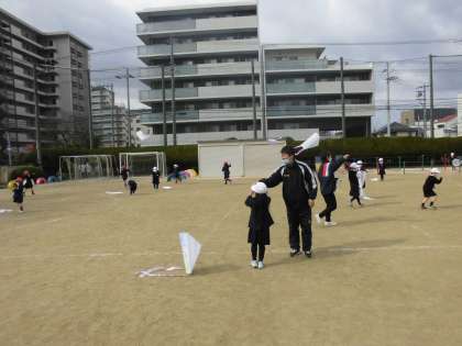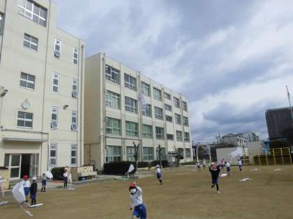 運動場は寒い中ですが、1年生は元気いっぱい!
