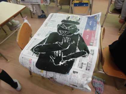 「おはなしの絵」という題材で、まずは鬼の顔を紙版画で表しました。