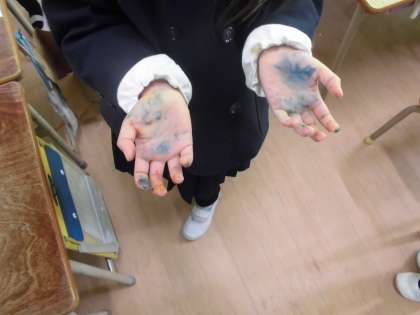 「先生みてー!!」とえのぐをついた手を見せてくれました!