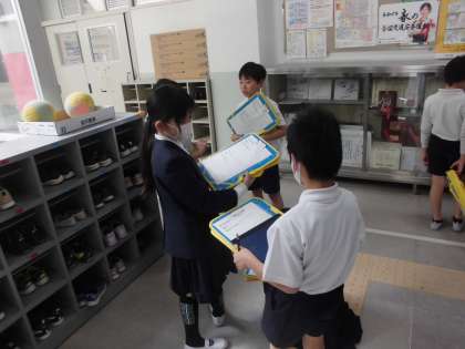 1時間目はその一環として、学校内でのみんなが気持ちよく暮らせるような仕組みや、ユニバーサルデザインがないかを探すために学校内を探検し、まとめる学習をしました。