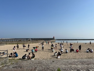 朝の集いの後に貝殻拾いを少し行い、今から朝食を食べます。