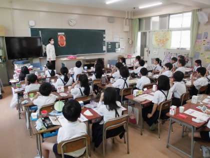 2年生では、歯科衛生士さんにきていただき、歯みがき指導をしていただきました。