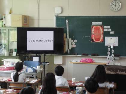 歯をそめて歯垢の残り具合をチェックして、正しい歯みがきの仕方を学習しました。