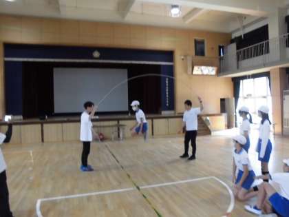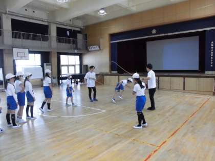実技研修では、6年生全員がダブルダッチを跳ぼうとチャレンジ!