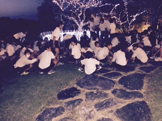 まず 非常口確認して避難訓練です。