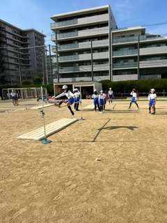6年生は、体育で走り高跳びの学習に取り組んでいます。日本記録は、235cmです。みんな、頑張って。