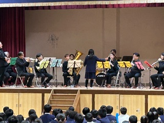 ウインドカンパニー管楽オーケストラの皆さんによる迫力ある演奏でした。誰でも名指揮者のコーナーでは、各学年1人ずつ指揮者の体験をしました。