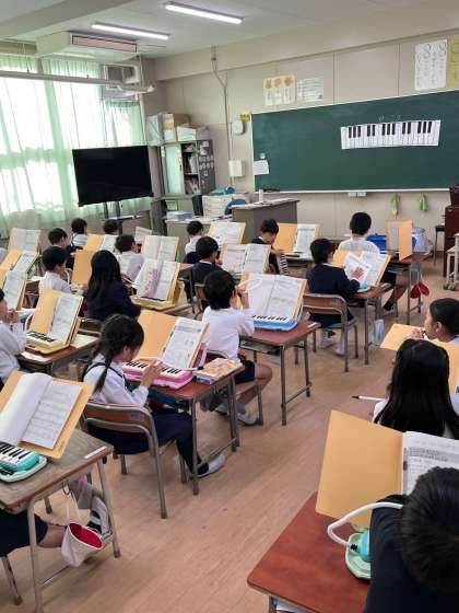 鍵盤ハーモニカで「かっこう」を演奏しています。みんながそろって、上手に演奏できました。