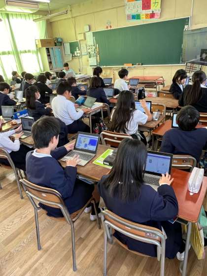 1人1台のタブレットを使って、プログラミングの学習をしています。子どもたちは、タブレットを使いこなしています。