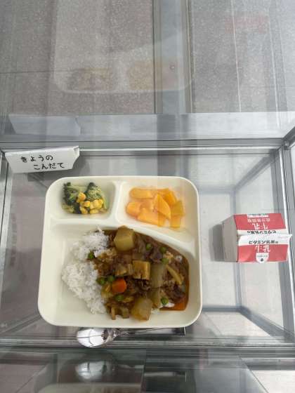 今日の献立は、冬野菜のカレーライス、牛乳、ブロッコリーとコーンのサラダ、黄桃です。2学期最後の給食です。カレーは、子どもたちの人気のメニューの一つです。