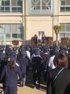校長先生からの講話。2年生代表児童が、二学期にがんばったことを発表。最後に松田先生から冬休みに気をつけることについてお話しがありました。