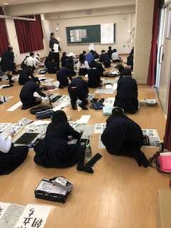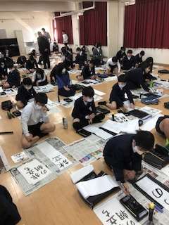いつもと違って、多目的室の床に半紙を広げて、真剣な面持ちで筆を運びます。お題は「旅立ちの朝」。上手に書けるかな?