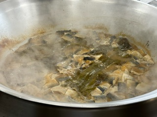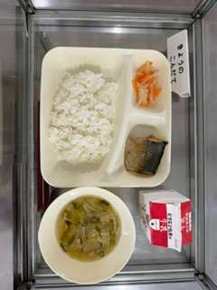今日の献立は、ごはん、牛乳、さばのみそ煮、すまし汁、紅白なますです。さばのみそ煮は、骨を上手にとりながら、食べていました。