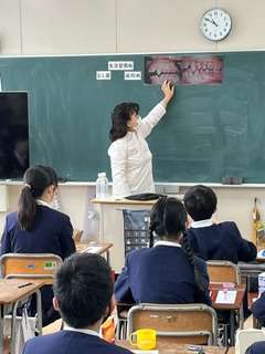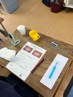 歯科衛生士さんに、歯と口の健康について、教えてもらっています。鏡を見ながらブラッシングの練習もします。