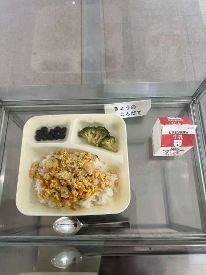 今日の献立は、親子丼、牛乳、ブロッコリーのごまあえ、黒豆の煮ものです。親子丼は、つゆだくにして、美味しかったです。