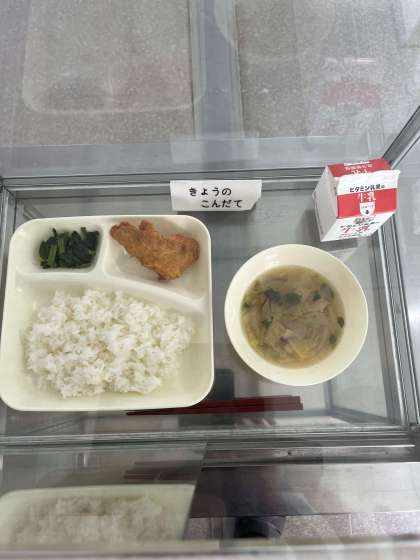 今日の献立は、ごはん、牛乳、たらフライ、うすくず汁、ほうれんそうのおひたしです。たらフライは、カラッと揚がっていて、食感が良かったです。