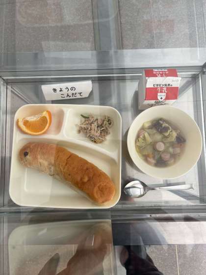 今日の献立は、レーズンパン、牛乳、ポトフ、ツナと野菜のソテー、いよかんです。ポトフは、肉やソーセージ、野菜からいい味が出ていました。