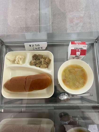 今日の献立は、黒糖パン、牛乳、豚肉のカレー風味焼き、コーンとはくさいのスープ、カリフラワーのレモンドレッシング、です。スープは、コーンの甘みがよく出ていて美味しかったです。