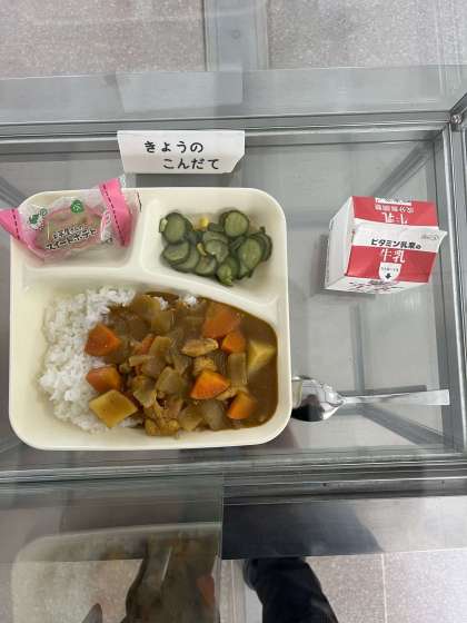 今日の献立は、チキンレバーカレーライス、牛乳、きゅうりとコーンのサラダ、スイートポテトです。袋に入ったスイートポテトは、給食で初めて出ましたが、甘過ぎず美味しかったです。