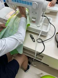 まち針とアイロンでしつけをして、ミシンでエプロン作りに取り組んでいます。集中して取り組んでいます。
