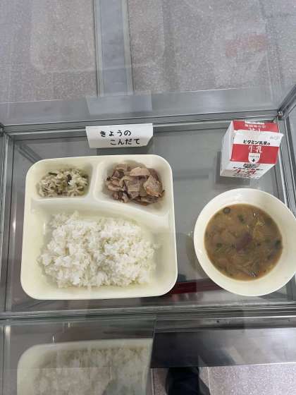今日の献立は、ごはん、牛乳、豚肉のしょうが焼き、さつまいものみそ汁、切干しだいこんのゆず香あえ、です。今日が本年度最後の給食となります。みそ汁はさつまいもの甘みとみその辛味が美味しかったです。残さずたべてください。