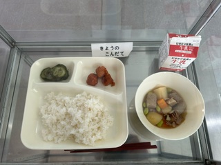 ご飯、牛乳、まぐろのオーロラ煮、豚肉と野菜の煮物、きゅうりの赤じそあえ