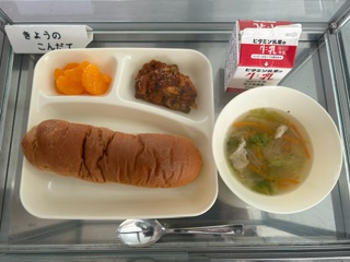 黒糖パン、牛乳、ジャガイモのミートグラタン、レタスのスープ、みかん(缶)