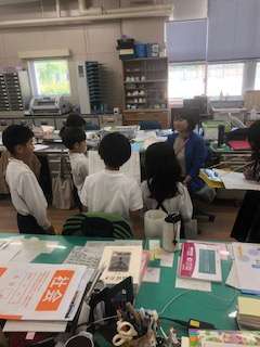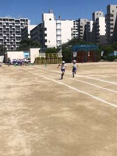 2年生が職員室の先生方にインタビュー。 3年生は風を切って、50mを全力で走り抜けていました。