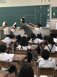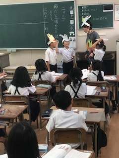 ネズミとネコのお面をつけて、役になりきって音読します。みんな楽しく学習していました。