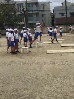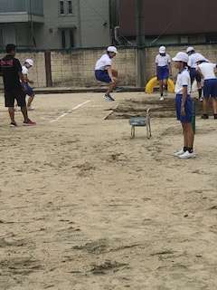 6年生は砂場で走り幅跳びです。ポートボール台から跳んで、空中姿勢を確認したあと、砂場で確かめながら、大きく跳躍していました。