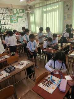 自分のカードを首から下げて、友だち同士で英語で会話をはじめます。