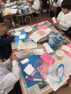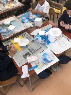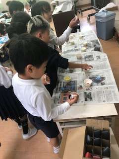 家から持ってきた空き箱を利用してケーキを作っています。どんなケーキになるかな。