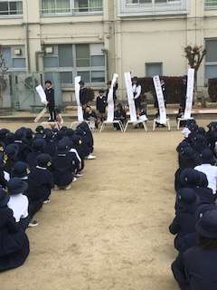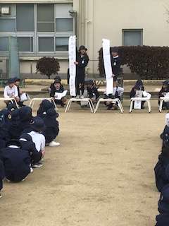 寒さが厳しい朝でしたが、運動場で始業式を行いました。校長先生のお話のあと、代表学年の発表です。今回は4年生が、がんばったことや目標などを5・7・5の川柳にまとめて発表しました。とても上手にまとめ、しっかりとした声で発表できていました。