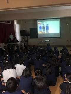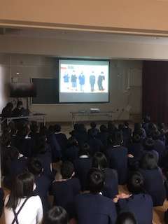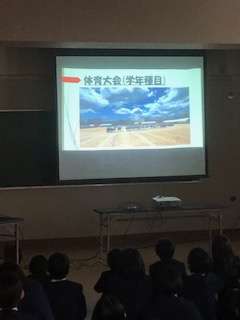 菫中学校生徒会が来校して中学校生活について説明してくれました。みんな一生懸命聞いています。