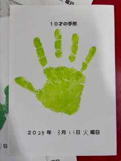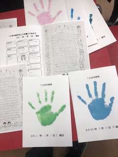 「十年後のわたしへ」 手形をとって、十年後の私に向けて手紙を書きました。