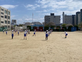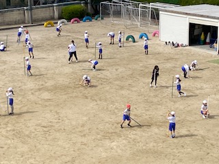 棒やフラフープを使って、体つくりの運動を楽しく実践中です!