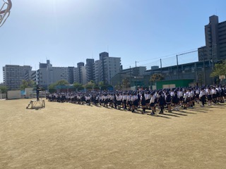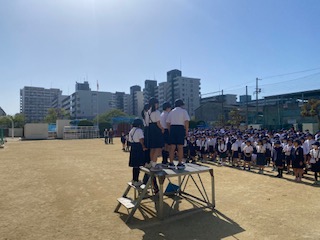 環境委員会から「関目東小学校をきれいにしましょう」をスローガンに、毎月の環境目標を考え 全校朝会でみんなに伝えました。