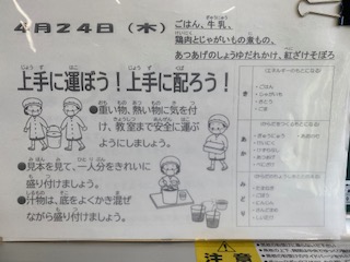 放送を聞いた子どもたちも、友だちと声をかけ合いながら協力して配膳を行い、気持ちの良い給食の時間となりました。