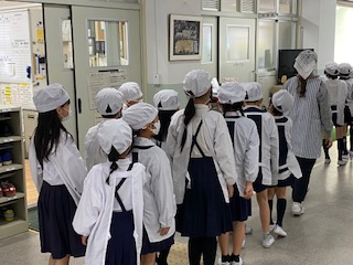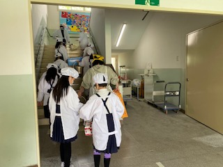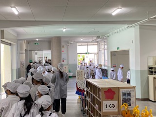 白衣に着替えた子どもたちが、きちんと並んで給食室へと向かいます。