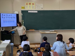 今日は、栄養教諭の先生から1年生に向けて、「給食」についての授業がありました。