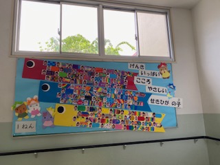 5月5日の「こどもの日」に合わせて、1年生の廊下には、元気いっぱいのこいのぼりが泳いでいます。