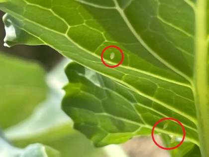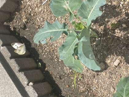 学習園を観察していると、モンシロチョウがブロッコリーの周りをひらひらと飛んでいました。時折止まっては、飛んでを繰り返しているので葉のうら側をのぞいてみると、小さな黄色いたまごがポツポツと。元気に育ってほしい思う反面、ブロッコリーの成育も気になるし、と悩ましい発見でした。