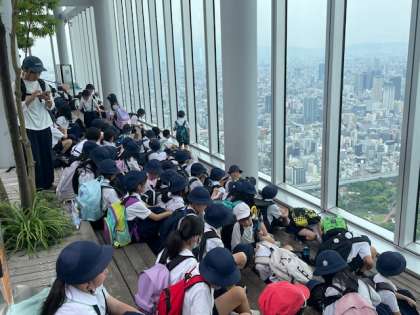 ゴジラの来襲にも負けず、しっかりと見学をすませました。雨がパラパラしているので58階をお借りして、食事です。大阪の街を見下ろしながら食べるお弁当は格別の味だと思います。