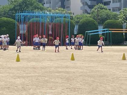 かけっこは、体の前(お腹の辺り)に広げた新聞紙を当て、それが落ちないように速く走ることを目あてにしていました。みんな、新聞紙が落ちないように、しっかりと手を振っていっしょうけんめい走っていました。