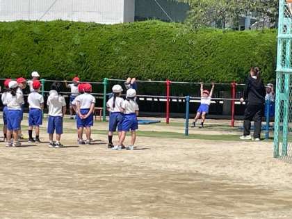 さわやかな天候の下、2年生が体育科でかけっこと鉄棒あそびをしていました。