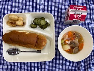 おさつパン、いかてんぷら、フレッシュトマトのスープ煮、きゅうりのバジル風味サラダ、牛乳 でした。