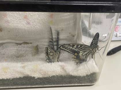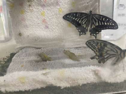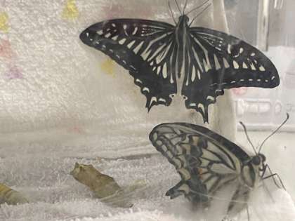 児童が飼育容器で卵から大事に育ててきたアゲハチョウの幼虫が成虫になりました。幼虫のころは、えさとなる葉を毎日新しいものと取り換え、さなぎになった時には下にタオルを敷いてお世話をしてきました。そのうちの一匹が先週末、もう一匹が昨日成虫となりました。二匹ともせまい飼育容器の中で元気に羽をばたつかせています。天気が悪いので、いつ放すか判断が難しいところです。