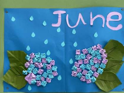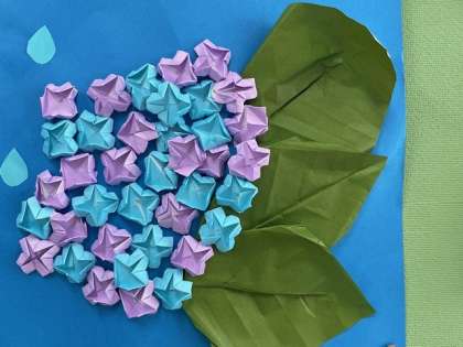 正面玄関を入ってすぐ右側にある掲示板。各学年の学年だよりを掲示している横のスペースに掲示委員会の人たちが作った作品があります。6月は「あじさい」、青を基調とし涼しげな色合いのあじさいが二つ飾られています。近づいてよく見ると、一つ一つの花びら(がく)の開き具合が違っています。この細やかな工夫で、立体感が増しているように感じます。