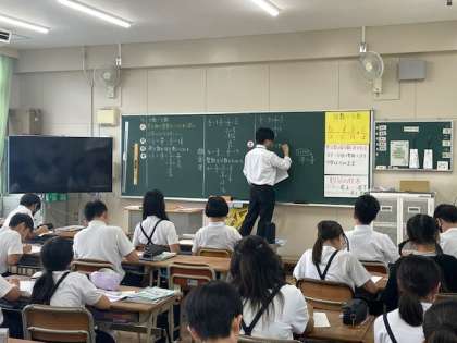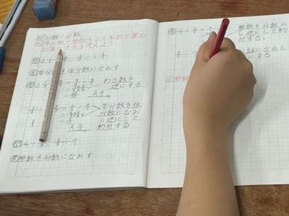 6年生は、算数科で「分数のわり算」で分数÷分数の学習をしています。昨日の学習のめあては「帯分数や整数をふくむわり算の計算の仕方を考えよう」。子どもたちは、これまでの学習をもとに解決の見通しをたて、解答を導き出していました。6年生らしく、自分の言葉で意見を述べたり、ノートを見やすくまとめたりもできていました。