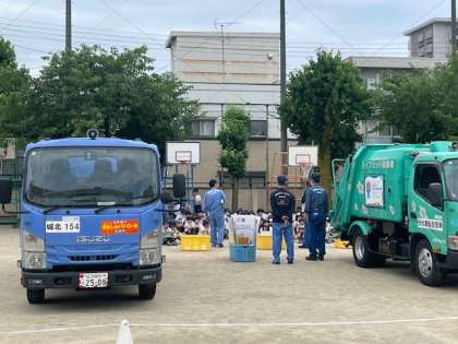 はじめに、ごみの分別についてのお話がありました。また、収集車は集めるごみの種類ごとにパッカー車の形や流す音楽が違うことについてクイズをを交えて教えていただきました。一番なじみのある普通ごみ収集時の音楽は『小鳥がくる町』といい「かわいい小鳥が来る町は〜」という歌詞があります。他の3曲は『しゃぼんだま』『赤とんぼ』『草競馬』です。どのごみが、どの曲か覚えていらっしゃいますか?